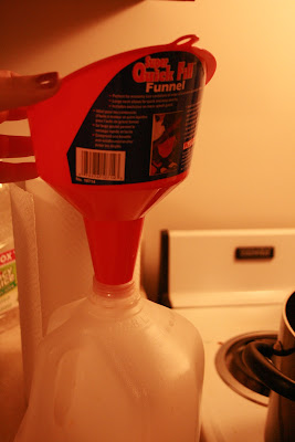 I later realized I had no way to get the drink from the stock pot to the jug, so I sent Mike out for a funnel. This'll do!